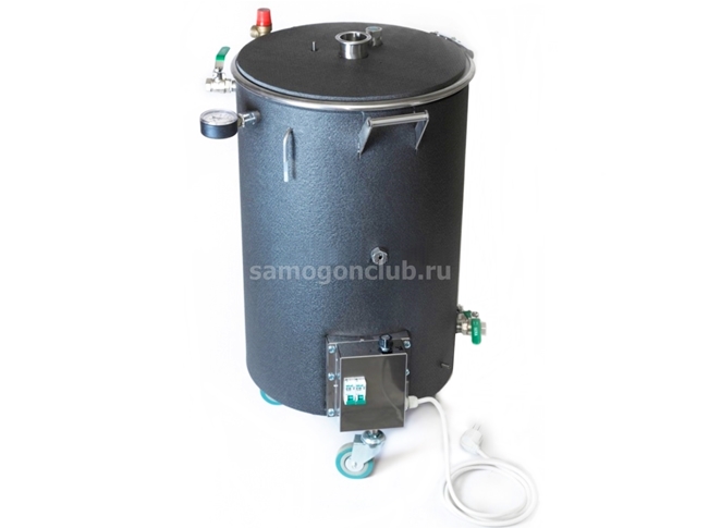 Пароводяной котел предназначен для варки густых браг, зерновых заторов, приготовления крепких алкогольных напитков. Данная модель применяется для меда, сыра, шампуня и прочих густых сред, требующих бережного нагрева рубашкой. Крышка утеплена. Блок управления закреплен на кубе, блок-ТЭН закручивается в муфту 1 1/4". Симисторный регулятор мощности обеспечивает плавную регулировку. Краны в рубашке - 1/2" Сливной кран в центре дна - 1 1/4" Диаметр вн емкости - 37,5 см Высота вн емкости - 55 см Мощность ТЭНов по умолчанию - 3,75 кВт, под заказ можно сделать 4,5 кВт.