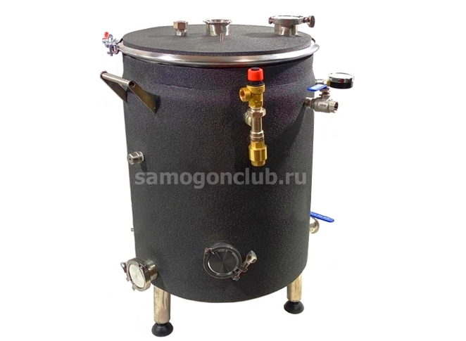 Пароводяной котел предназначен для варки густых браг, зерновых заторов, приготовления крепких алкогольных напитков. Котел утеплен, крышка утеплена. Слив из центра дна с отводом, с шаровым краном кламп 2" (по умолчанию слив не поворотный). На крышке два клампа 2". Нет ТЭНов, нет колес (приобретаются отдельно). Краны в рубашке - 1/2" Высота внутренней емкости - 67 см Диаметр внутренней емкости - 39 см. Манометр - есть Группа безопасности - есть Кламп под ТЭН для прямого нагрева - есть (с заглушкой)